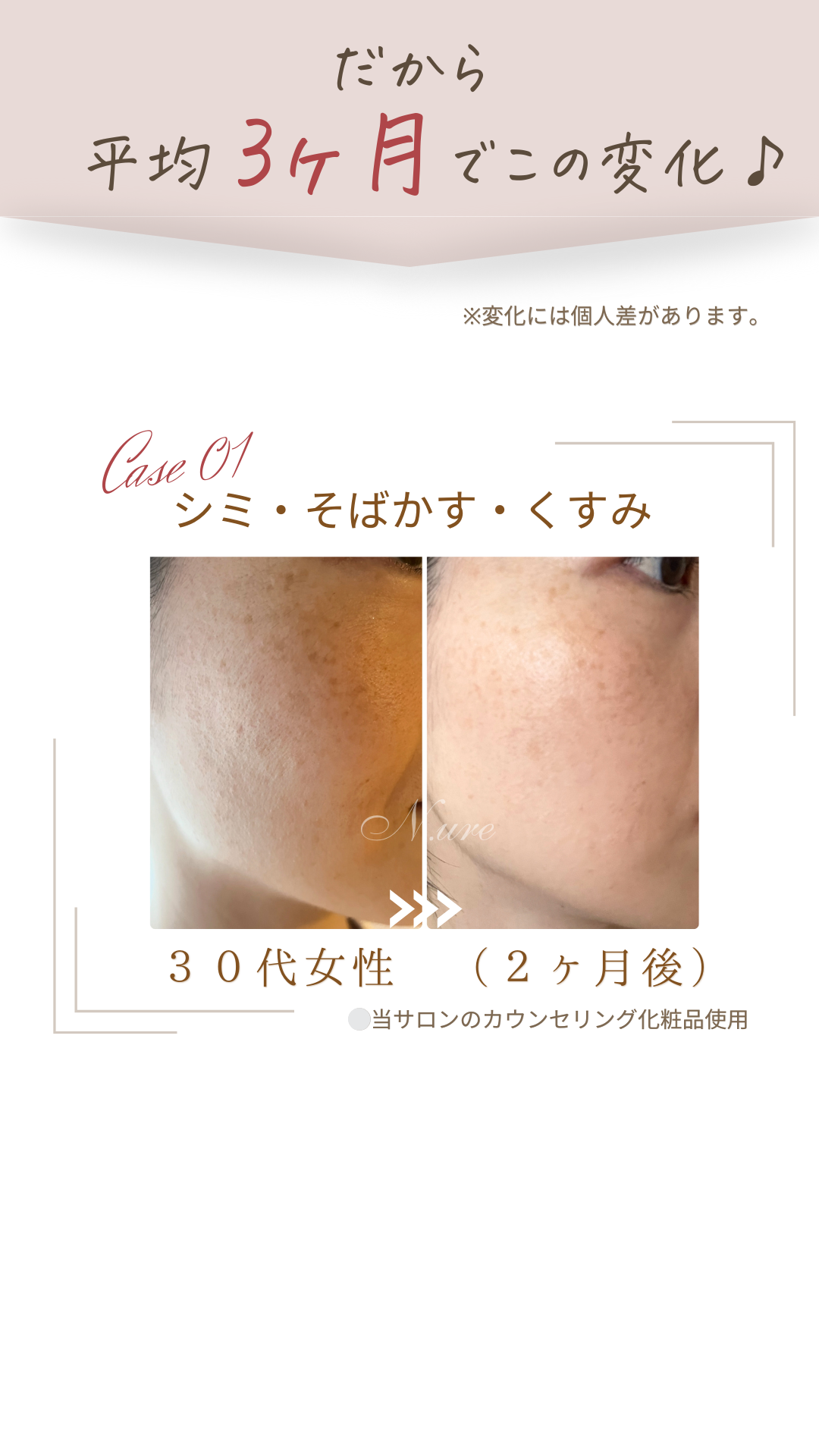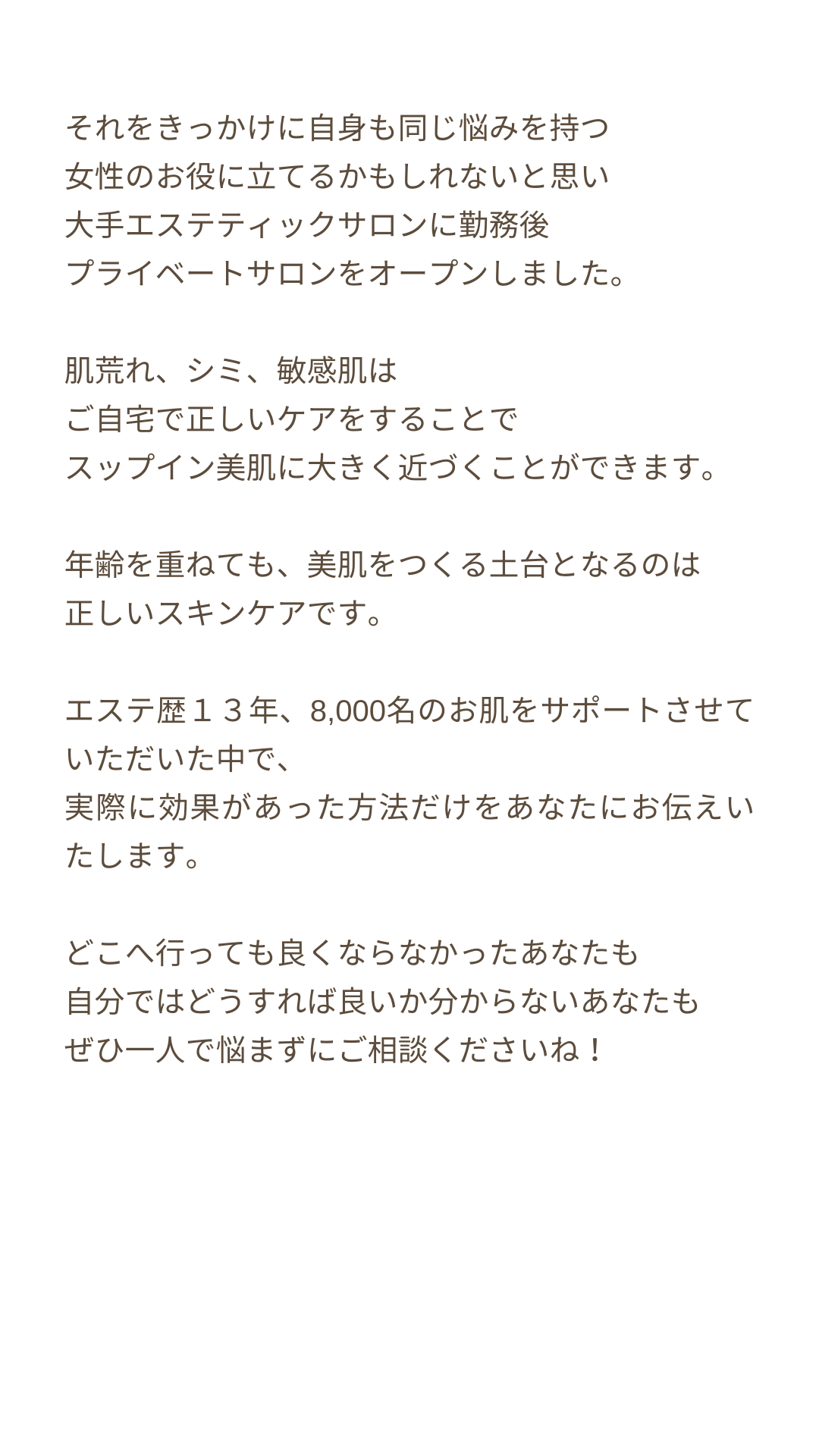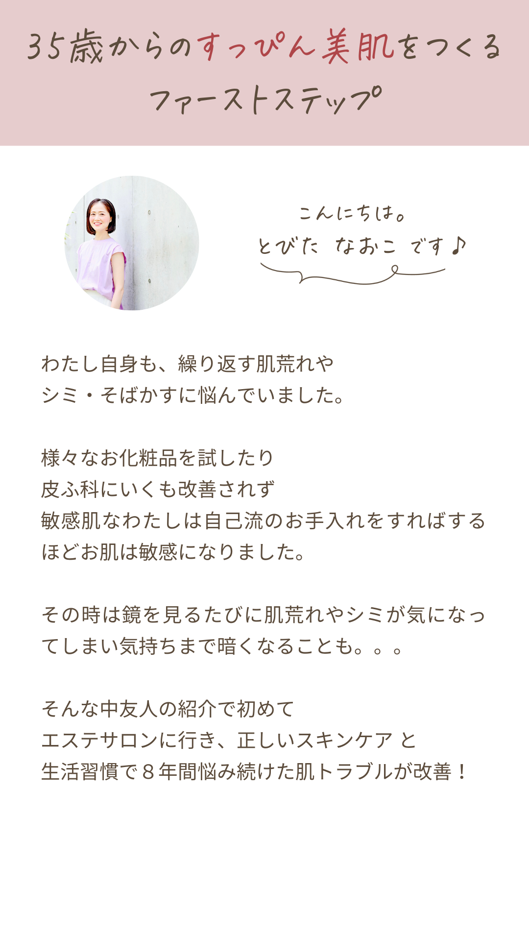最後に… 30代、40代はお肌だけではなくカラダも心も無だれやすい時期です。 特に子育てや家事、お仕事にお忙しい女性も多く 体質の変化から新たなお肌トラブルもでできます。 だからこそ、自己流のケアでなかなかお肌が変わらず、悩んでいる時間はとてももったいないと感じます。 あなたにあった方法を知ると 毎日のスキンケア をほんのちょっと変えただけで、 ゆるがないお肌の土台ができ お肌の透明感もグンと上がります♪ 「年々肌悩みが増えていってこの先どんどん老化していくのがこわかったけど 安心できました」 「肌荒れをファンデーションで隠していたけど すっぴんでも気にならなくなりました」 などとお声をいただくのがとても嬉しいです^^ お肌がキレイになると 自分に自信が持てたり、毎日をより楽しく過ごすキッカケにだってなります。 あなたも一緒にすっぴん美肌を手に入れませんか?^^