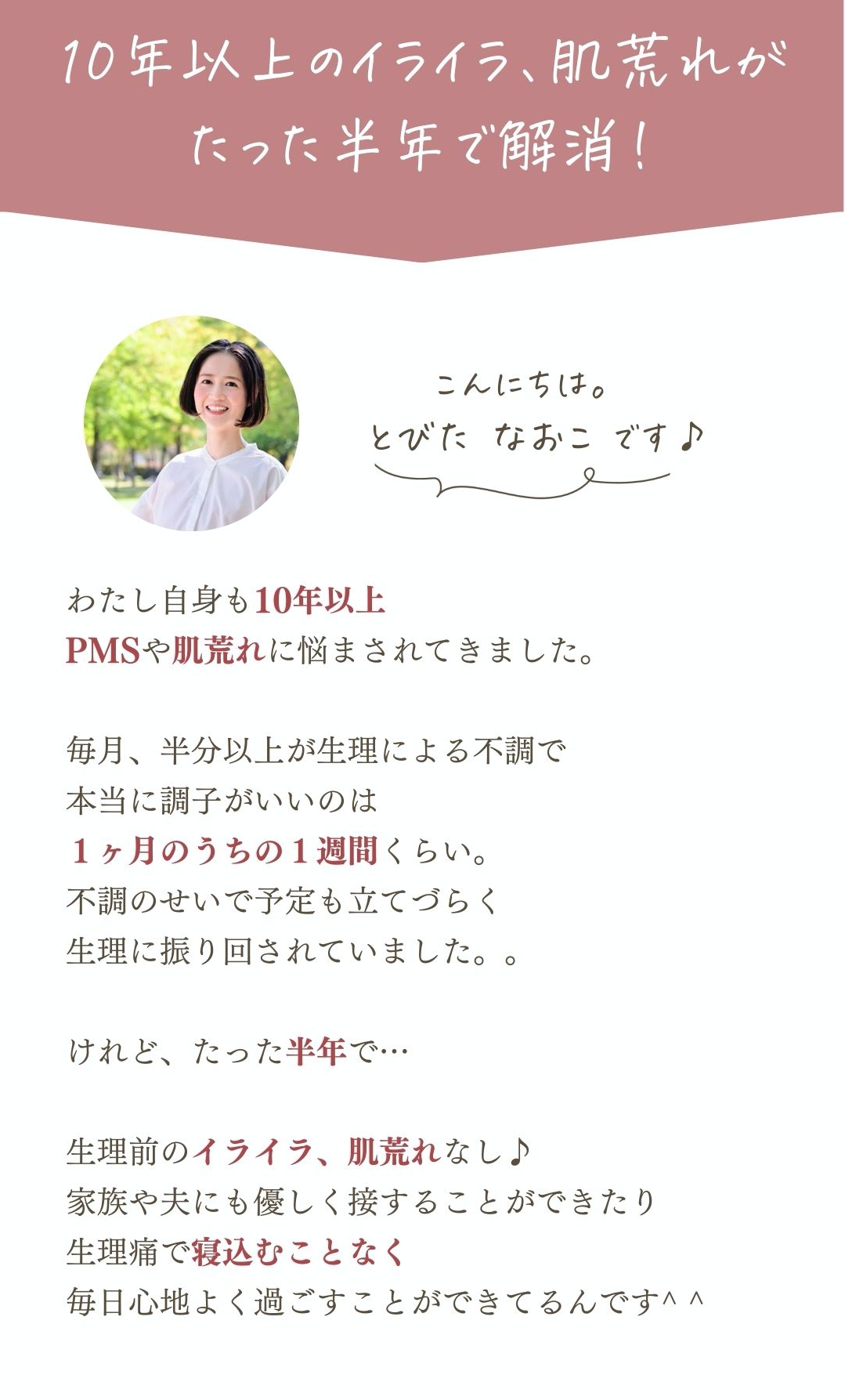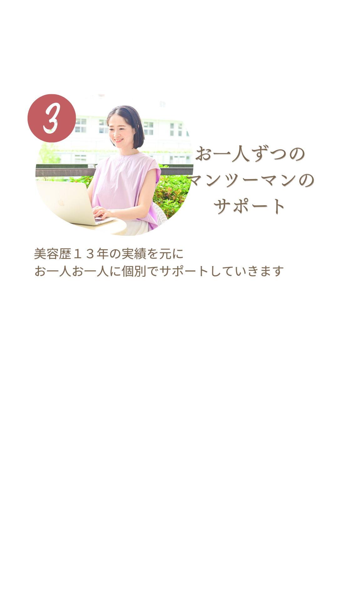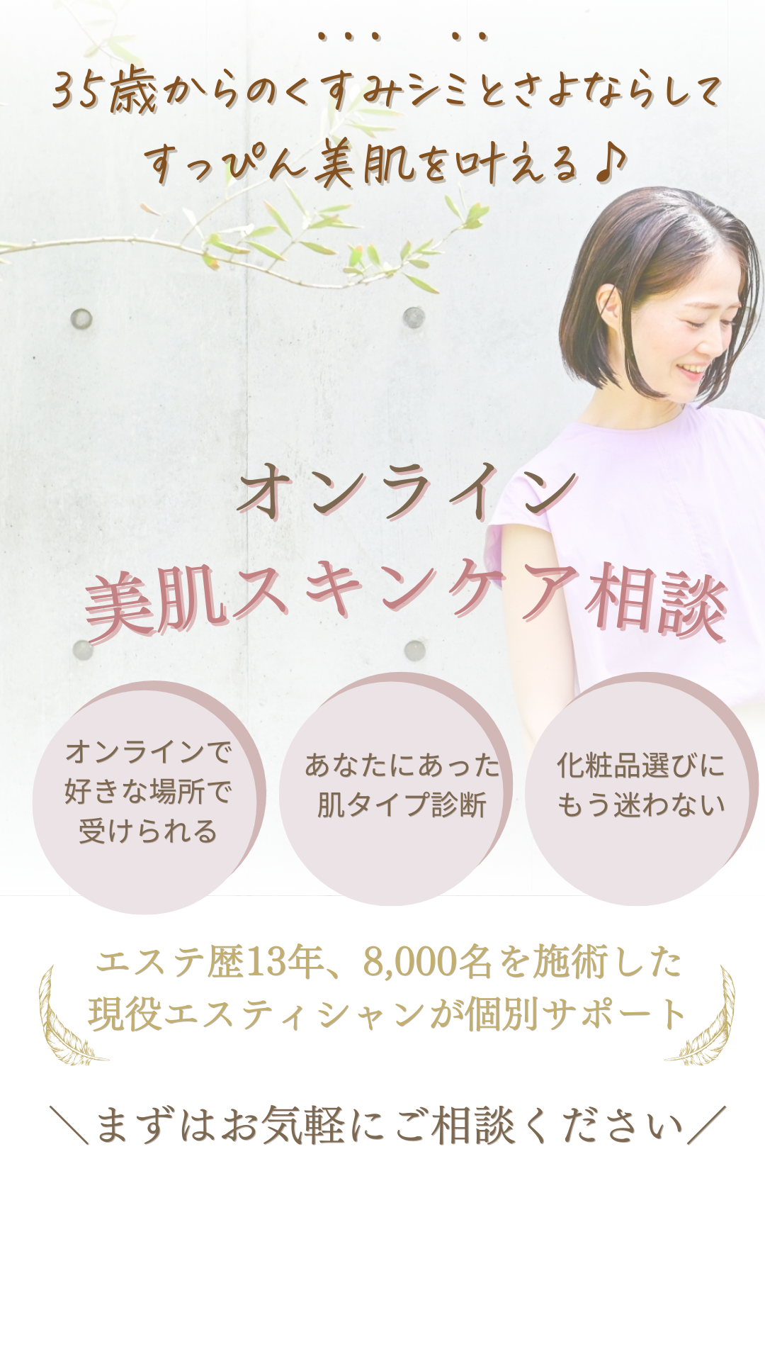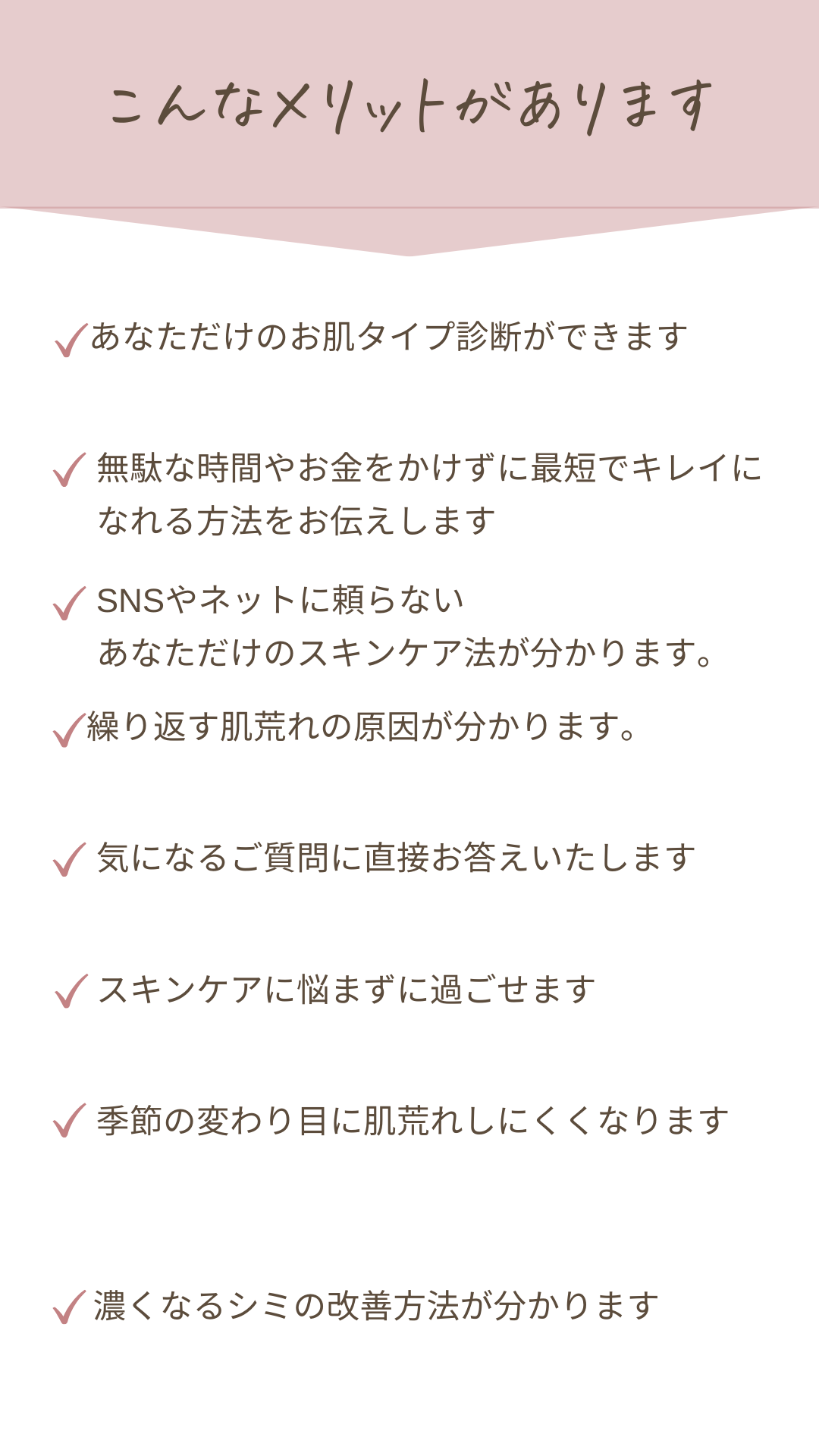 最後に… 30代、40代はお肌だけではなくカラダも心も無だれやすい時期です。 特に子育てや家事、お仕事にお忙しい女性も多く 体質の変化から新たなお肌トラブルもでできます。 だからこそ、自己流のケアでなかなかお肌が変わらず、悩んでいる時間はとてももったいないと感じます。 あなたにあった方法を知ると 毎日のスキンケア をほんのちょっと変えただけで、 ゆるがないお肌の土台ができ お肌の透明感もグンと上がります♪ 「年々肌悩みが増えていってこの先どんどん老化していくのがこわかったけど 安心できました」 「肌荒れをファンデーションで隠していたけど すっぴんでも気にならなくなりました」 などとお声をいただくのがとても嬉しいです^^ お肌がキレイになると 自分に自信が持てたり、毎日をより楽しく過ごすキッカケにだってなります。 あなたも一緒にすっぴん美肌を手に入れませんか?^^