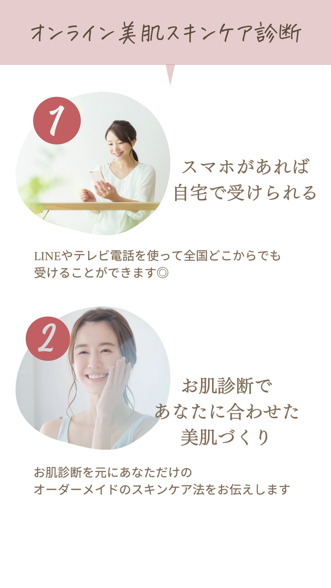 スマホがあればご自宅で簡単にご利用いただけます^^ 基本的にはテレビ電話を使って直接お話しをしますが、育児中なとで難しい場合はLINEのメッセージのやりとりで肌診断も可能です。 お気軽にご相談くださいね^^